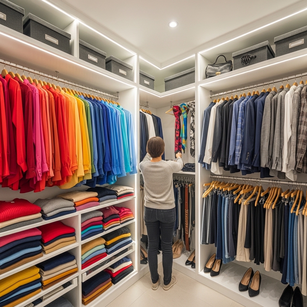 같은 카테고리 안에서 색상 순서로 정렬하면 코디할 때도 한 눈에 파악이 돼요. 밝은 색에서 어두운 색 순서로 배열하는 게 일반적이에요.